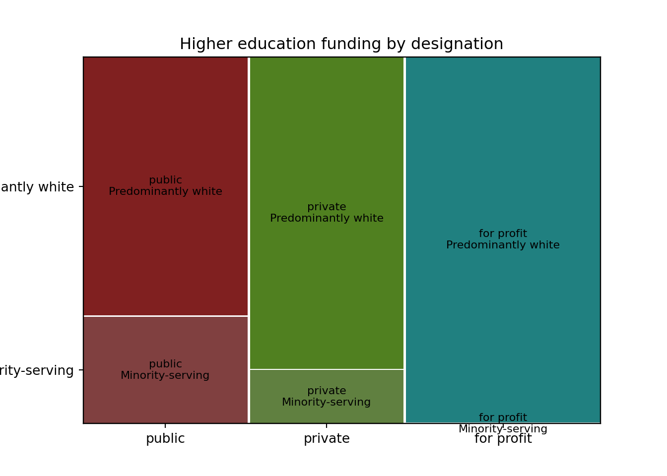 title = "Higher education funding by designation",subtitle = "Minority-serving schools are likelier to be public, less likelier to operate for profit.") +