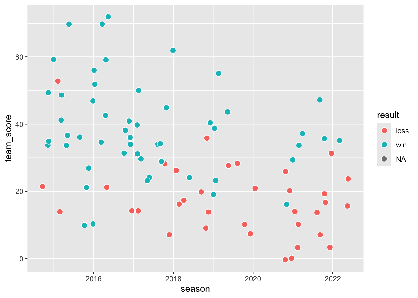 guides()function allows for adjustments to the legend. Here, the colored dot for wins and losses is enlarged, and the dots for attendance are colored a solid gray. Without this second adjustment, the dots have an empty fill and white outlines, making them invisible.