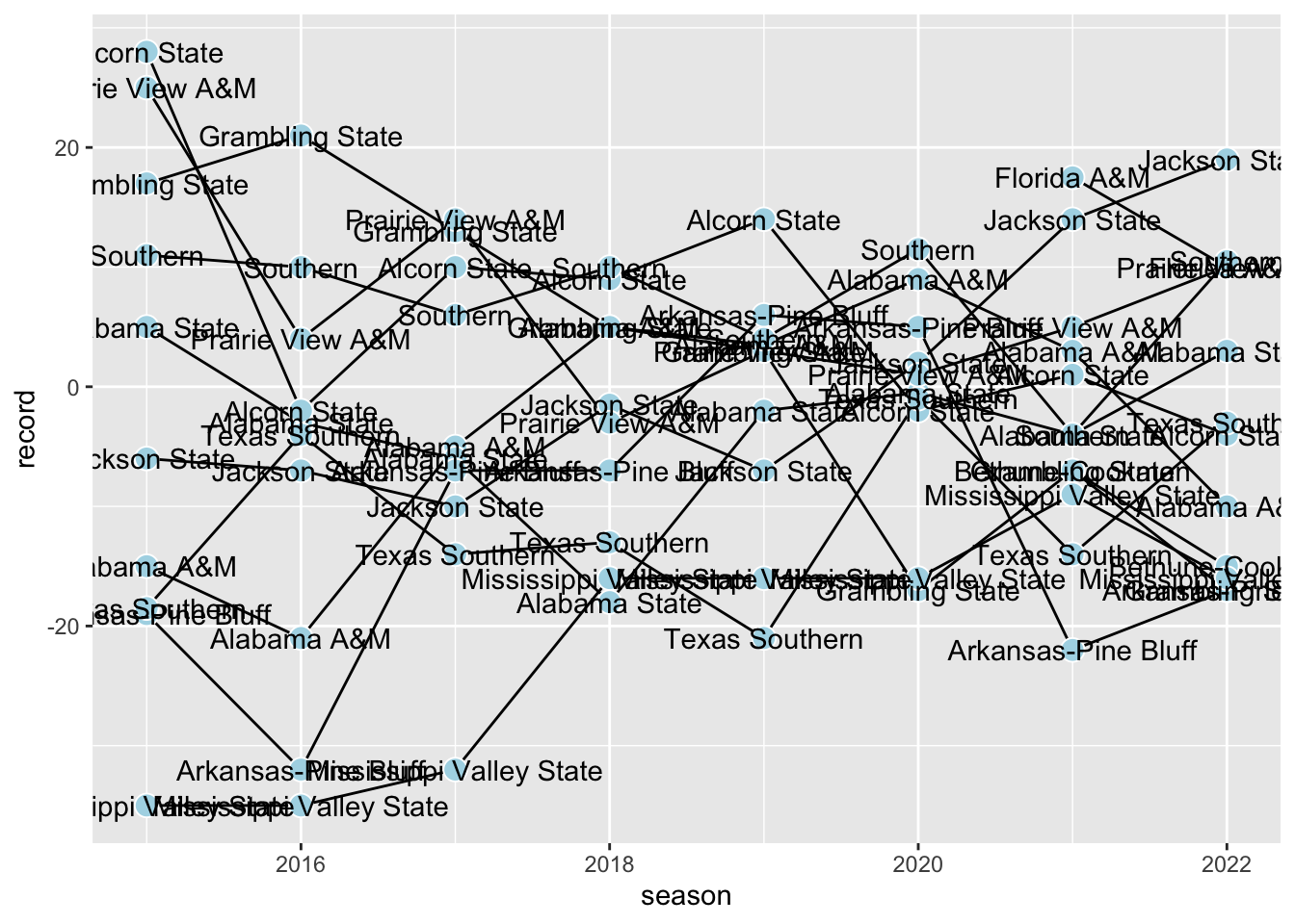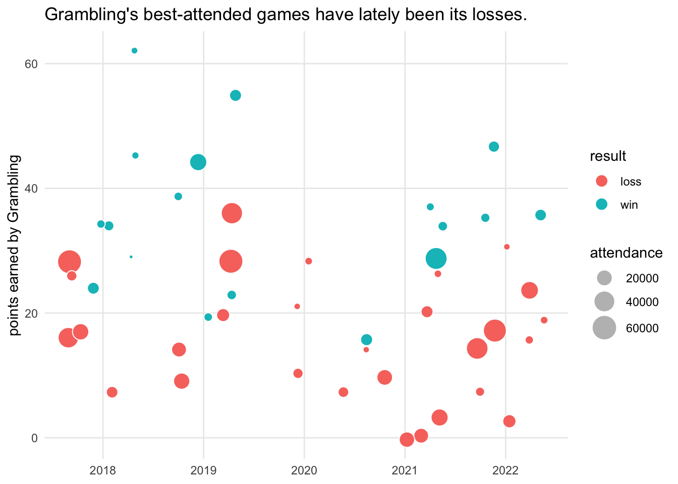 From here, we might even adjust the size of dots to show how big the audiences were to watch Grambling win or lose. Unfortunately, our data lacks audience sizes for seasons when Grambling had an exceptional record!