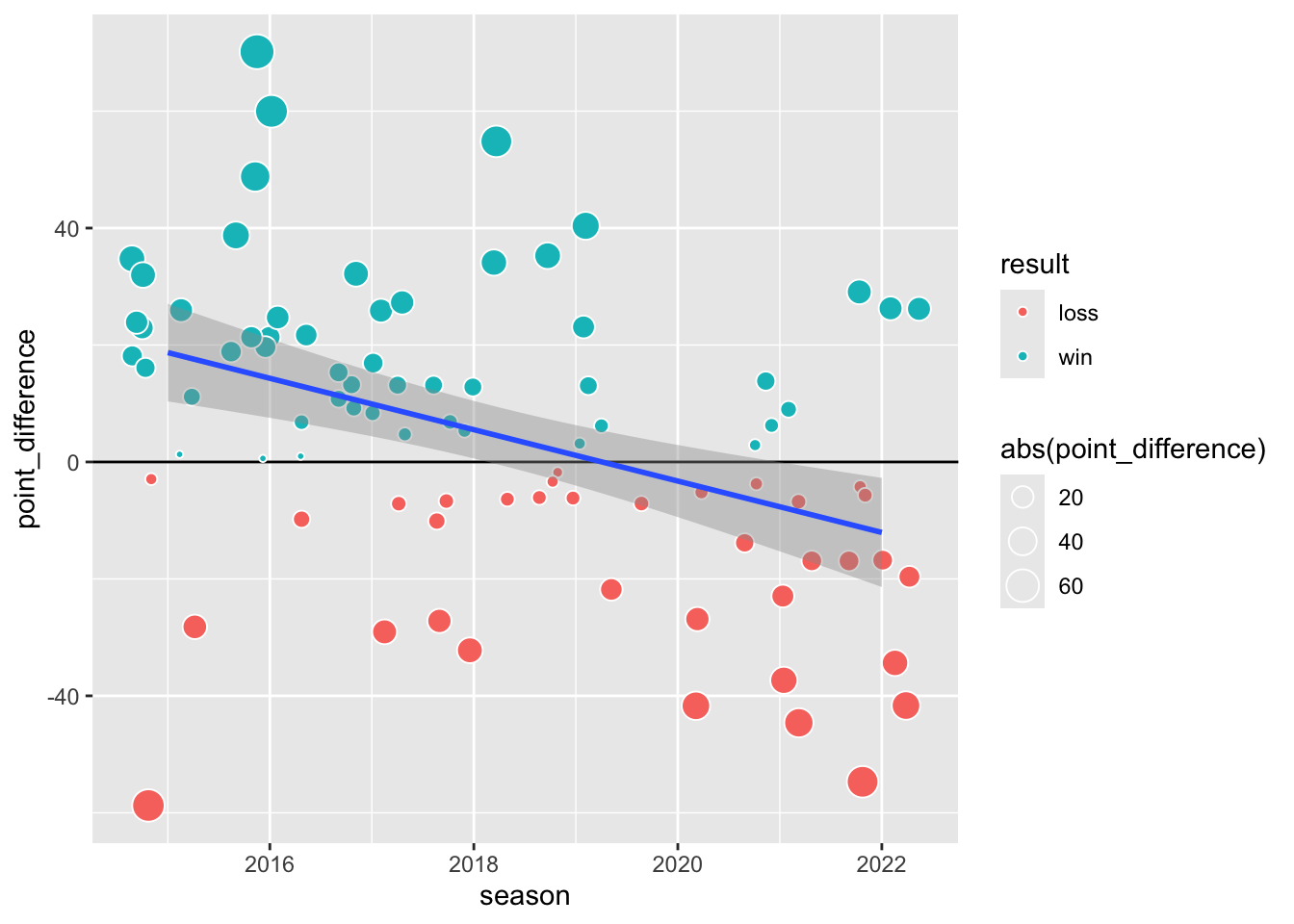 abs()function here stands for “absolute value.” It allows dots to grow when the point difference is further from zero, using smaller dots to indicate when a game was particularly close.