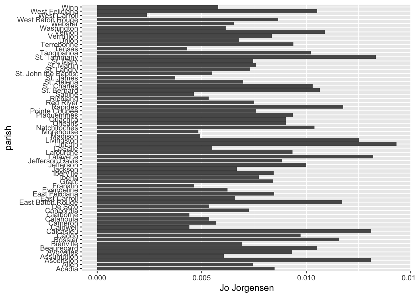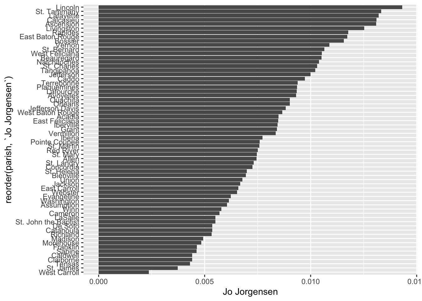 votes_percentages ggplot(aes(y = reorder(parish, `Jo Jorgensen`),