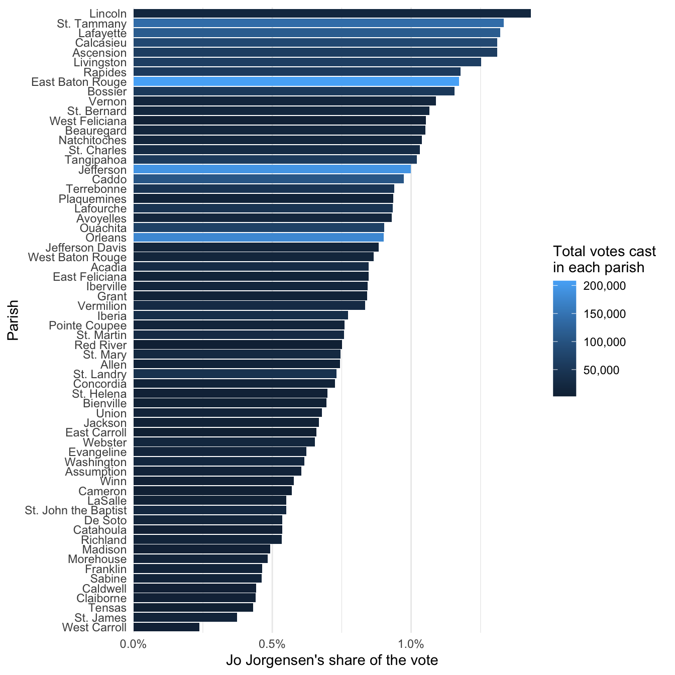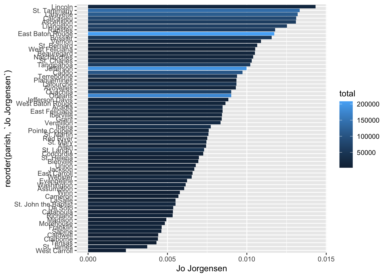 Check out Lincoln Parish! Since we know the total number of votes in each parish, we can also color the bars by parish size. Who knows—it might reveal some trend.