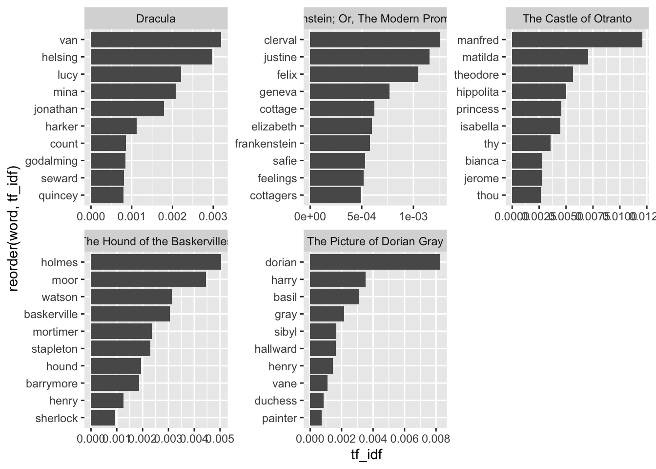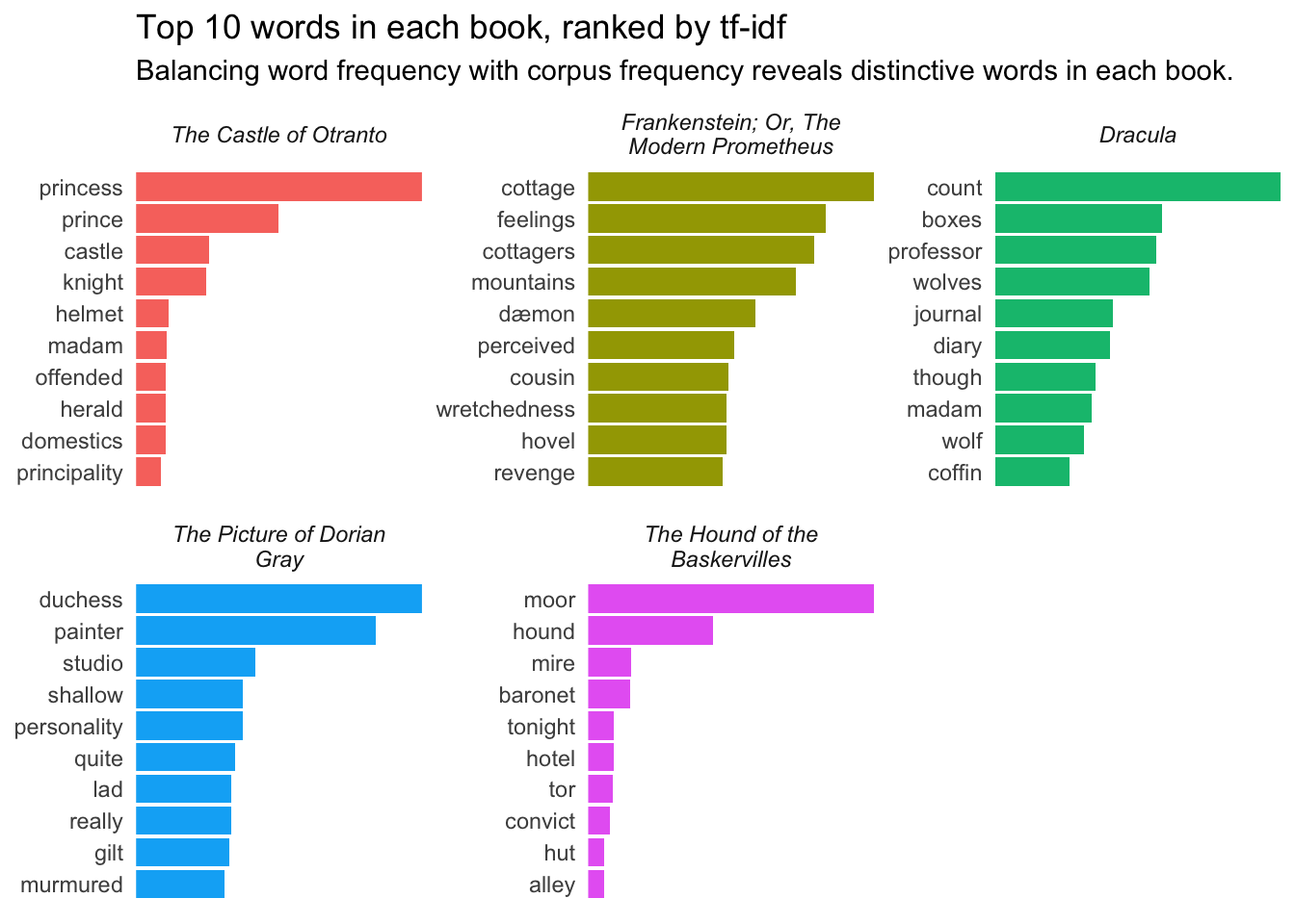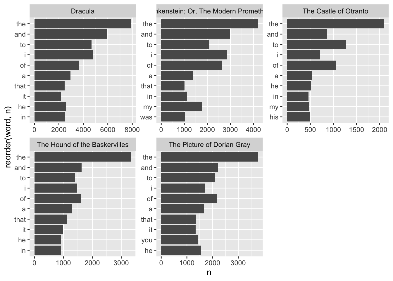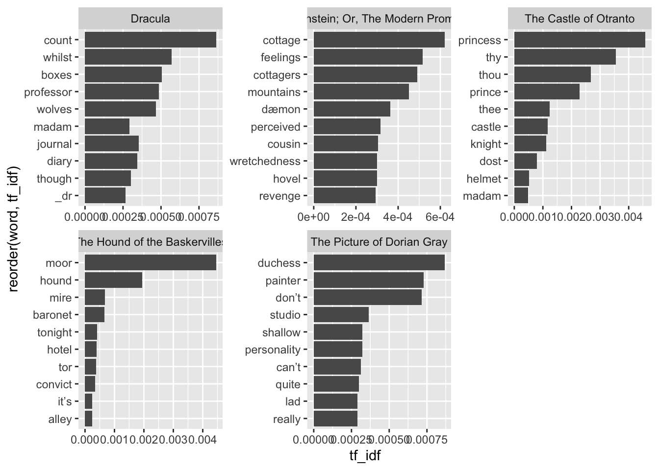 filter(title %in% c("The Castle of Otranto", "Frankenstein; Or, The Modern Prometheus", "Dracula", "The Picture of Dorian Gray", "The Hound of the Baskervilles"))